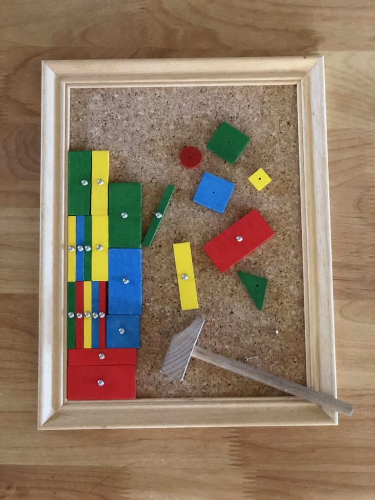 色板の穴に小さなを釘を通しコルク板にハンマーで打ちつけパターンを作ります。